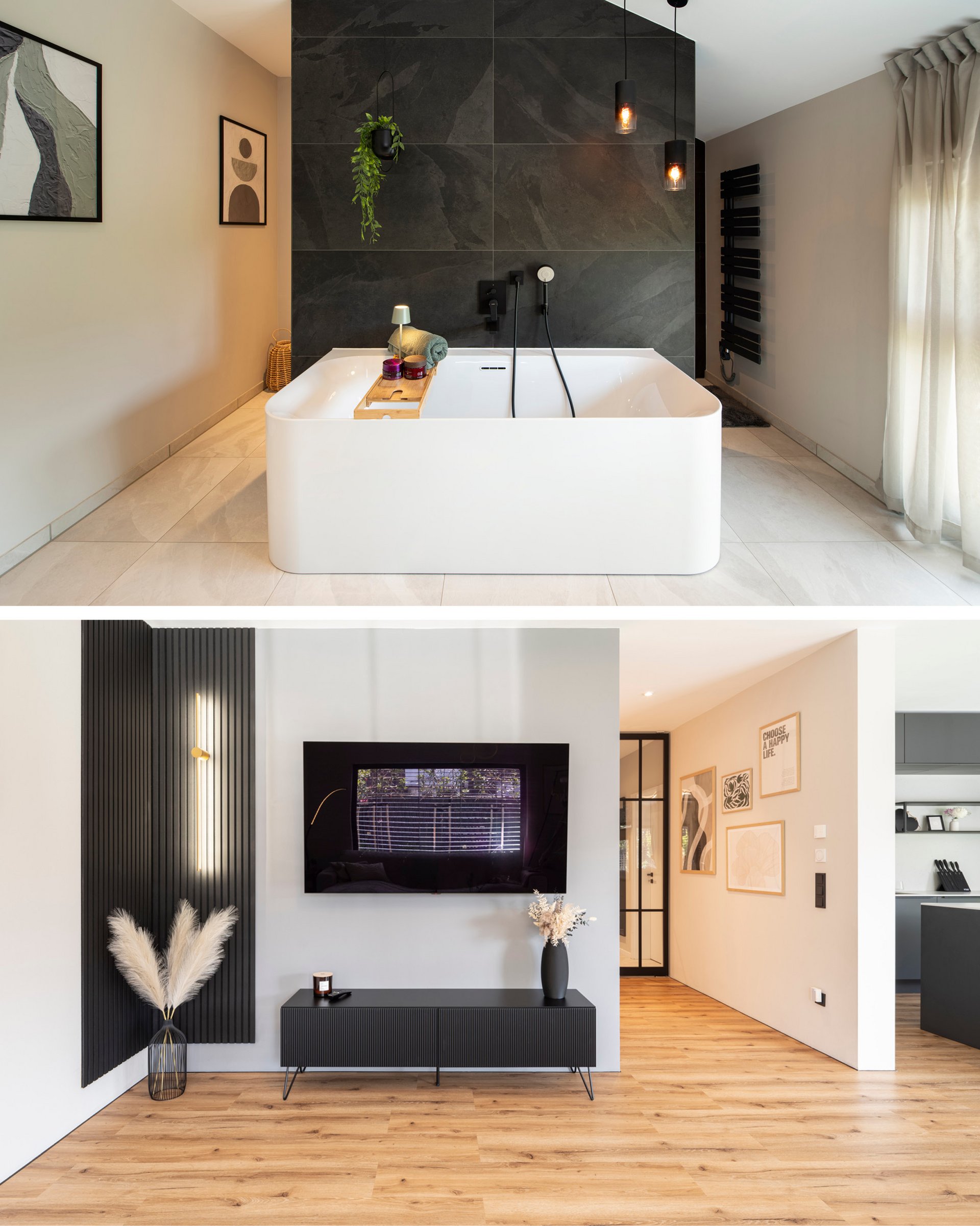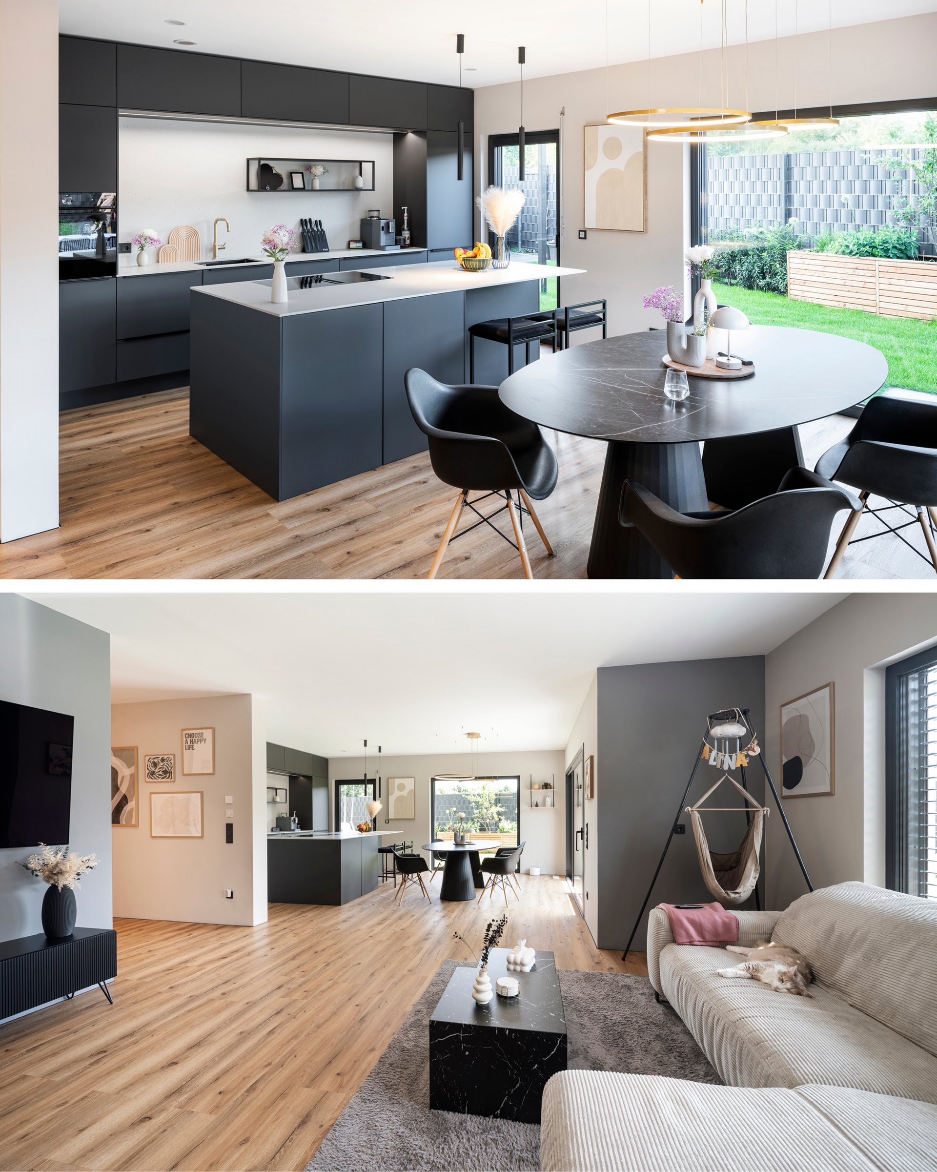 Eine besondere Herausforderung bei Doppelhäusern ist die Raumaufteilung und die Belichtung. Hier kann das Finger-Haus der Familie Bruder besonders punkten: Der lichtdurchflutete, offene Wohn-, Ess- und Kochbereich vermittelt ein großzügiges Raumgefühl. Diese Großzügigkeit setzt sich im Obergeschoss fort, wo sich neben dem Elternschlafzimmer ein geräumiges Familienbad, zwei Kinderzimmer und ein Fitnessraum befinden.