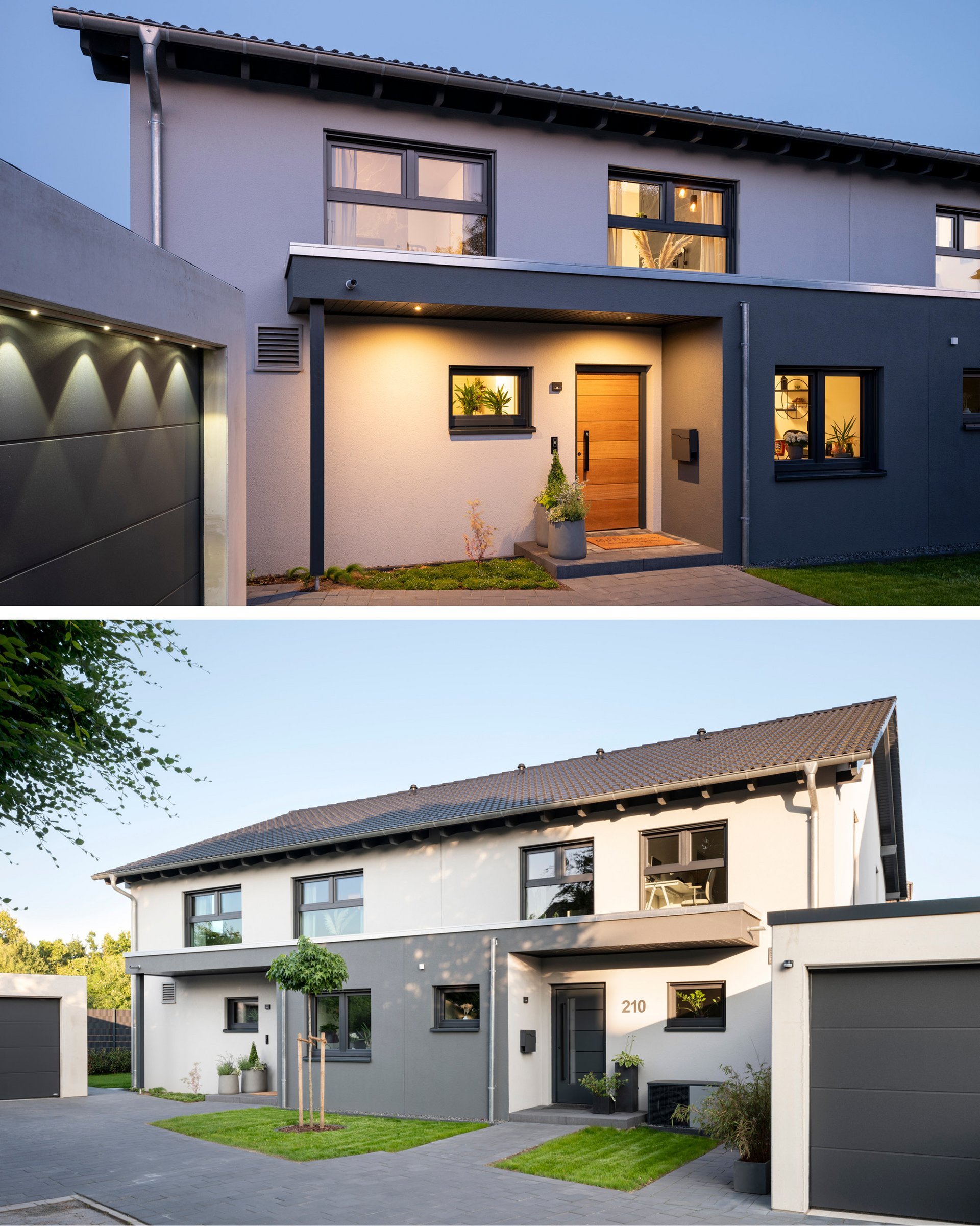 Das Doppelhaus der Familie Bruder basiert auf dem Hauskonzept DUO 258 von FingerHaus, wurde jedoch individuell geplant. Die Haushälfte, die durch die Bauherren bewohnt wird, bietet dank einer durchdachten Raumaufteilung und 167 Quadratmetern Wohnfläche viel Platz für Eltern und Kinder. Trotz der zwei unterschiedlich großen Wohneinheiten überzeugt das Doppelhaus in Summe mit einem harmonischen und einheitlichen Erscheinungsbild. Aus der Verlängerung des eingeschossigen Erkers entsteht auf beiden Seiten ein praktisches Vordach für die jeweilige Eingangstür.