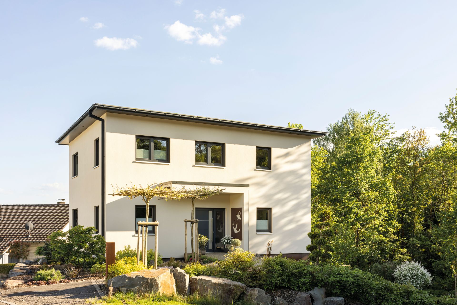 Das frei geplante Kundenhaus zeigt eine klare Bauhausarchitektur mit kubischem Baukörper, Flachdach und Attika. Die moderne Formensprache wirkt ruhig und präzise und fügt sich selbstverständlich in die Hanglage ein. Durch die Staffelung der Geschosse entsteht eine spannende Raumwirkung mit klar definierten Ebenen.