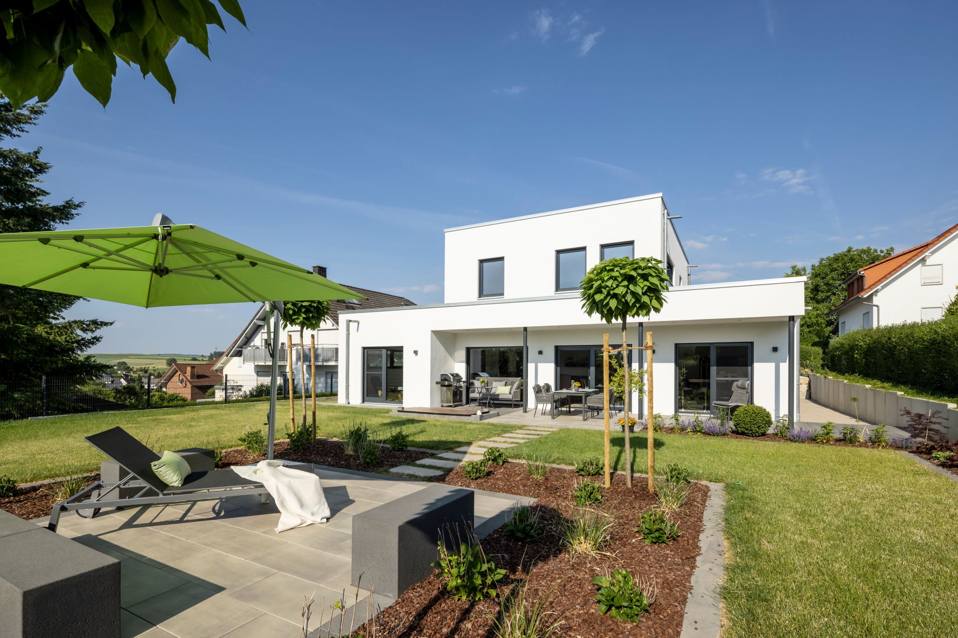 Architektonisch entschieden sich die Bauherren für einen modernen Flachdachbungalow mit Attikageschoss. Die schneeweiße Fassade unterstreicht die klare Linienführung und verleiht dem Haus eine zeitlose, hochwertige Ausstrahlung. Großzügige Fensterflächen sorgen für viel Tageslicht und schaffen eine offene Verbindung zwischen Innen- und Außenraum.