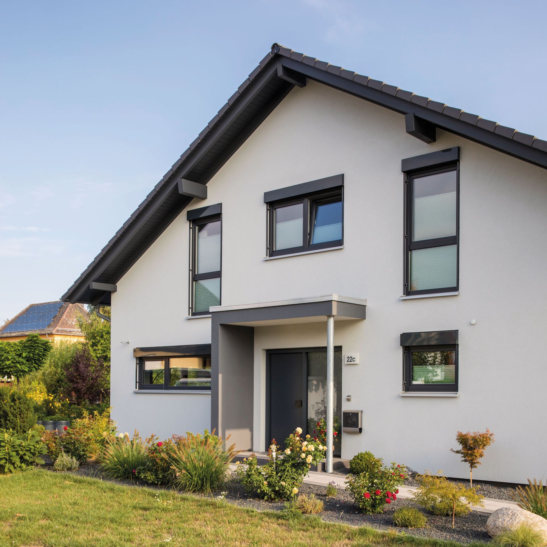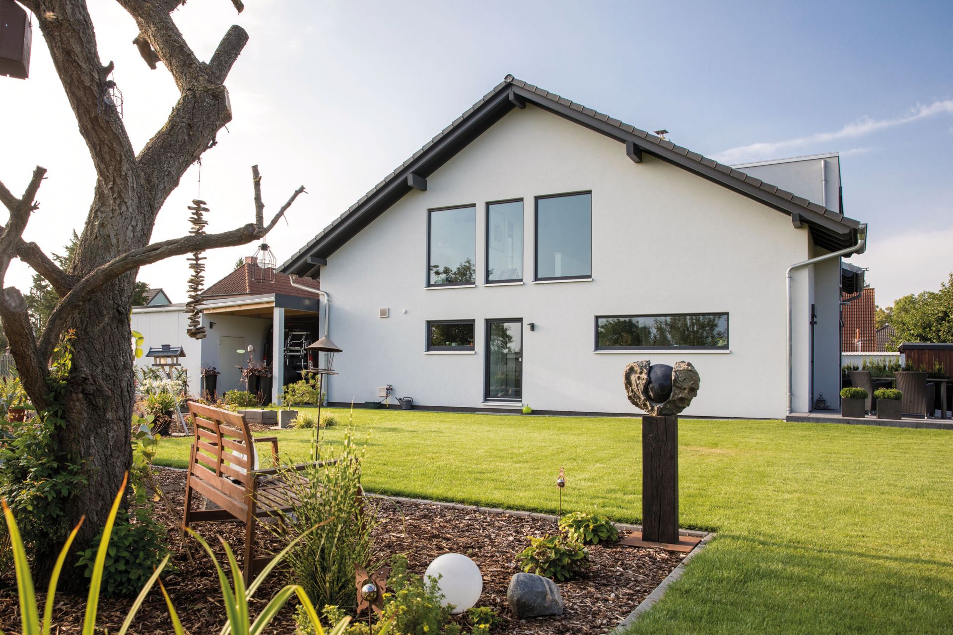 Architektonisch entschieden sich Claudia Meffert und Werner Gebauer für ein klassisches, eineinhalbgeschossiges Haus mit Satteldach. Die äußere Gestaltung ist klar und ruhig, wird jedoch durch gezielte Details belebt. Ein Flachdacherker, bodentiefe Fenster, farbige Putzstreifen und ein Lichtband setzen Akzente und lassen viel Tageslicht ins Haus.