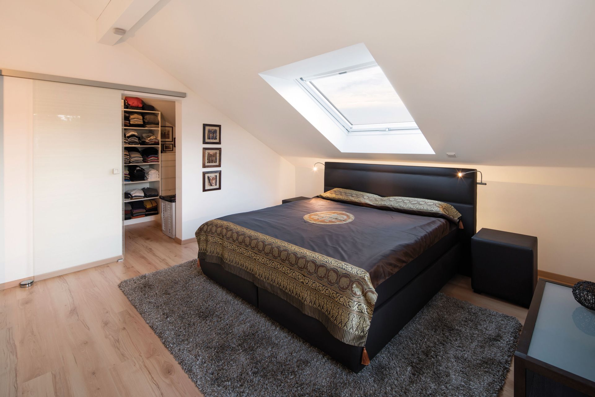 Das Erdgeschoss ist großzügig und klar strukturiert. Der offene Wohn-, Ess- und Kochbereich bildet das Zentrum des Hauses. Ergänzt wird diese Ebene durch ein Gästezimmer, einen großen Hauswirtschaftsraum sowie ein Gäste-Duschbad mit integrierter Sauna. Im Dachgeschoss befinden sich die privaten Rückzugsräume: ein großzügiges Schlafzimmer mit separater Ankleide, ein Arbeitszimmer, das Bad sowie zusätzliche Abstellflächen, die geschickt unter der Dachschräge genutzt werden.