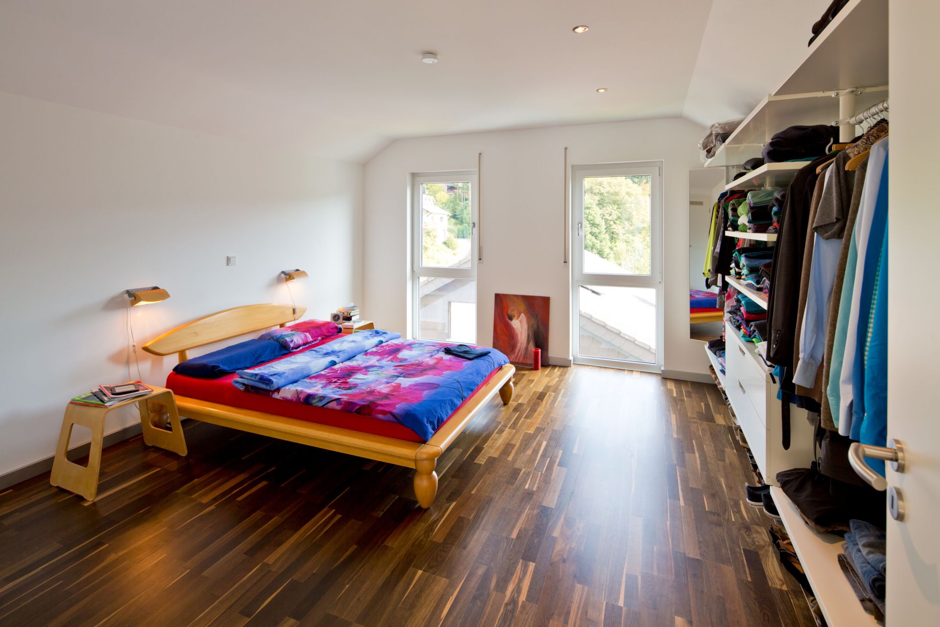 Dieses Architektenhaus zeigt, wie sich ein Hanggrundstück in ein lichtdurchflutetes Zuhause verwandeln lässt. Große Glasflächen holen die Natur ins Haus und eröffnen eindrucksvolle Ausblicke. Ein Balkon und eine überdachte Terrasse erweitern das Wohnerlebnis nach draußen. Innen überzeugt ein offener Wohnbereich mit klarer Struktur und moderner Ausstattung. Die durchdachte Geschossaufteilung mit Wohnbereich im Erdgeschoss, Elternbereich im Dachgeschoss und separatem Kinderbereich im Kellergeschoss unterstreicht das architektonische Konzept. So entsteht ein individuelles Finger-Haus, das Panorama und Komfort perfekt verbindet.