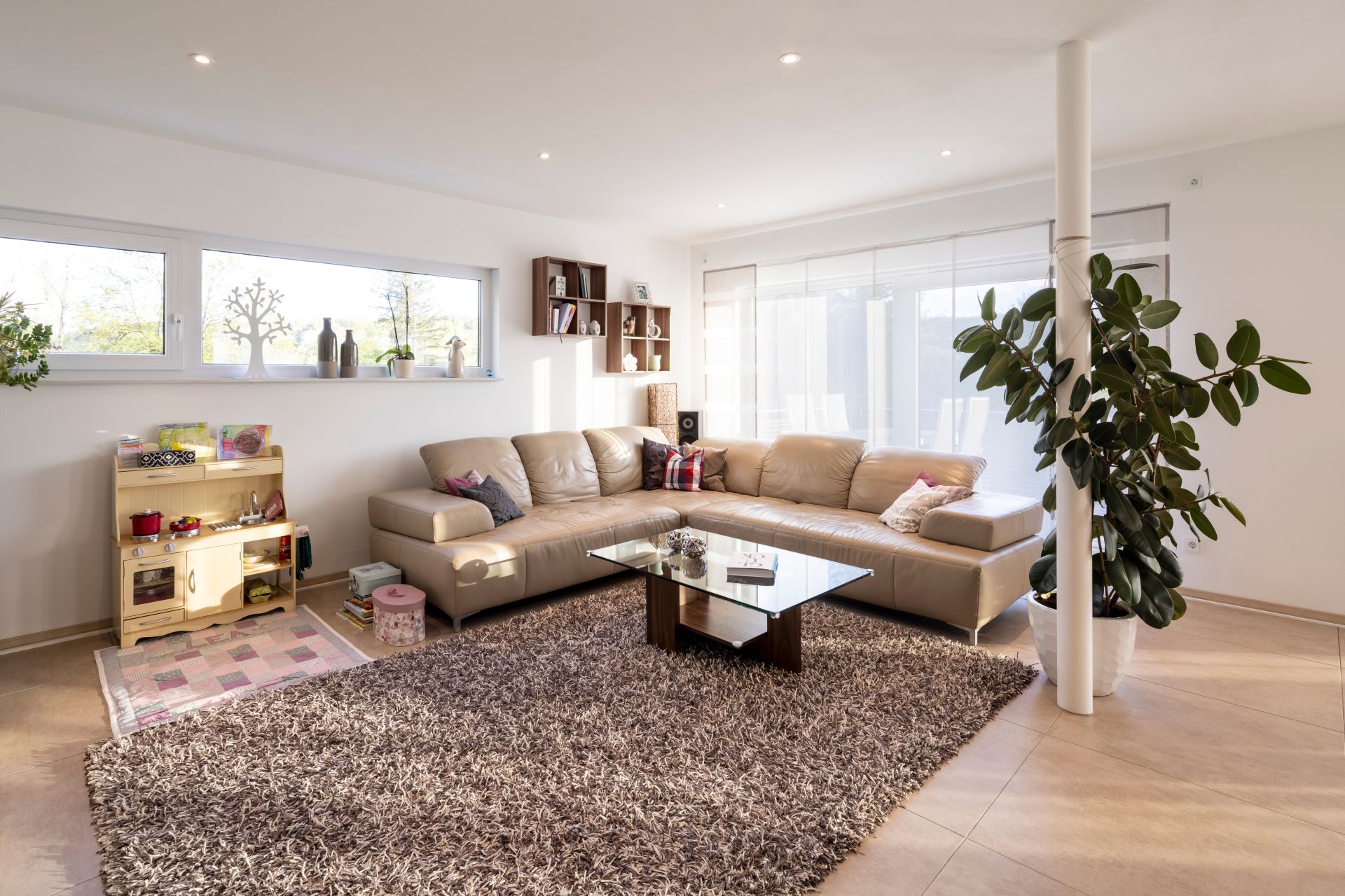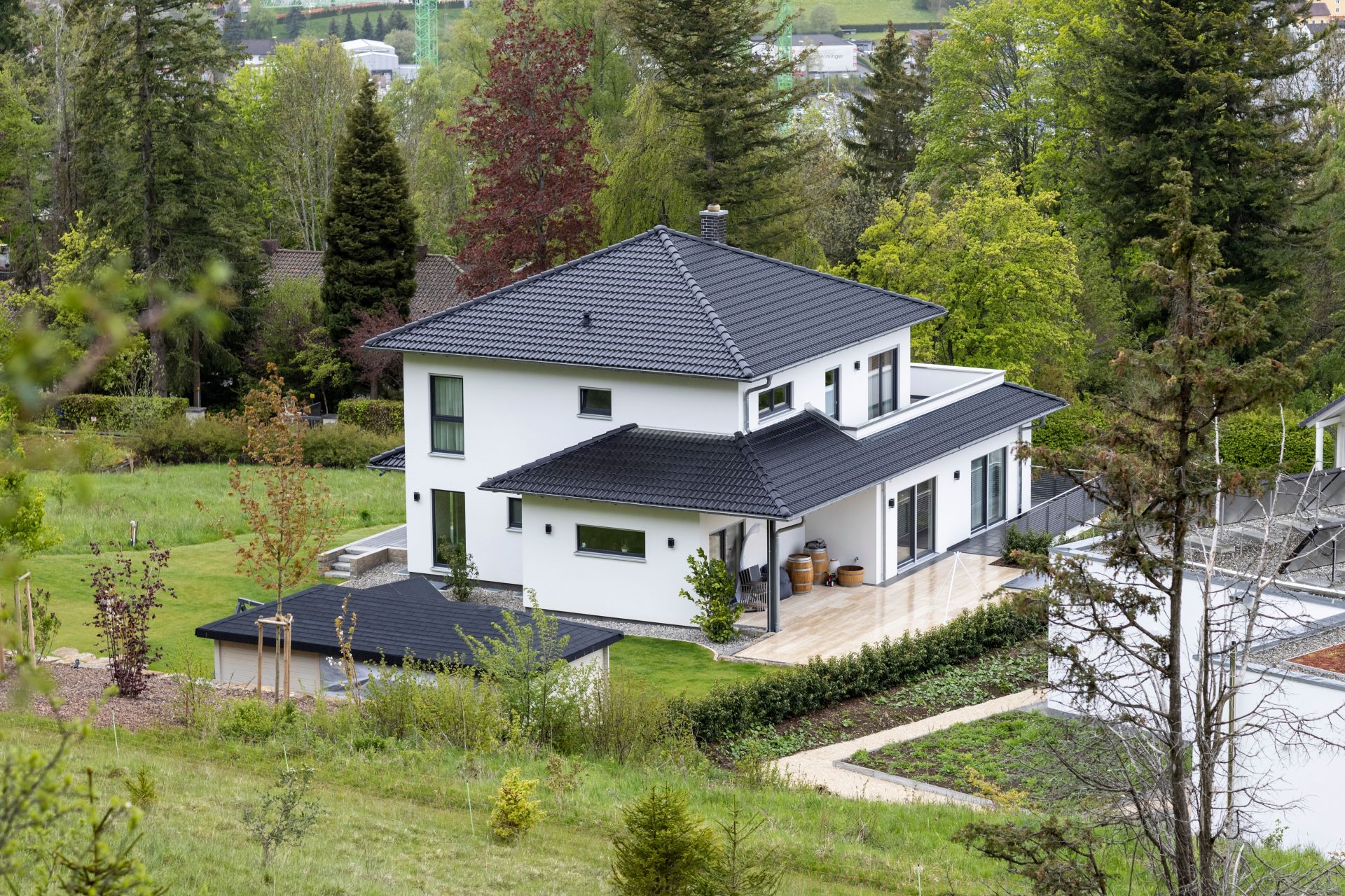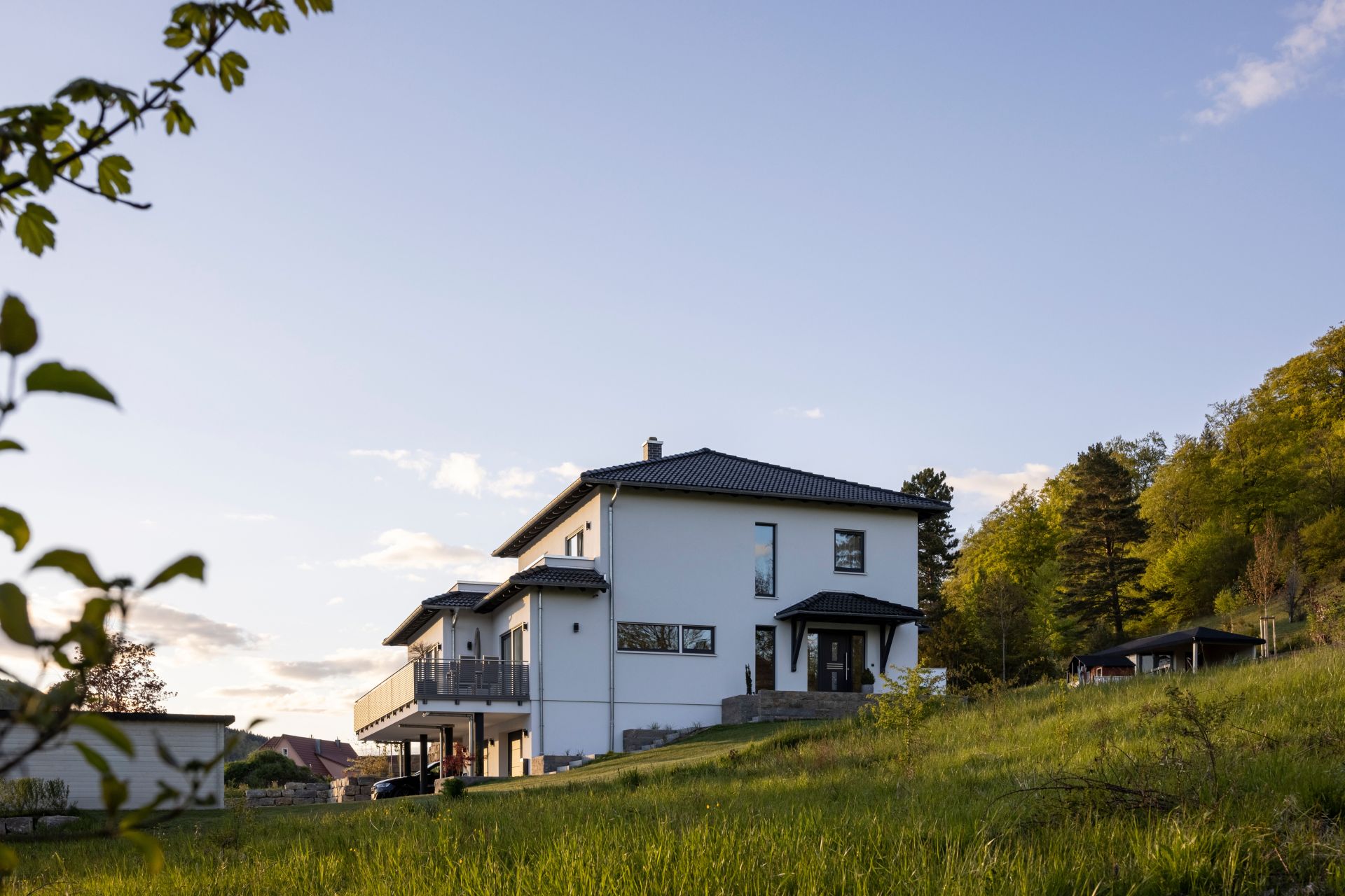 Ein frei geplantes Zuhause in Hanglage – mit Walmdach, Loggia, Balkon, Kaminofen und großzügigen 357 m² Wohnfläche über drei Ebenen.