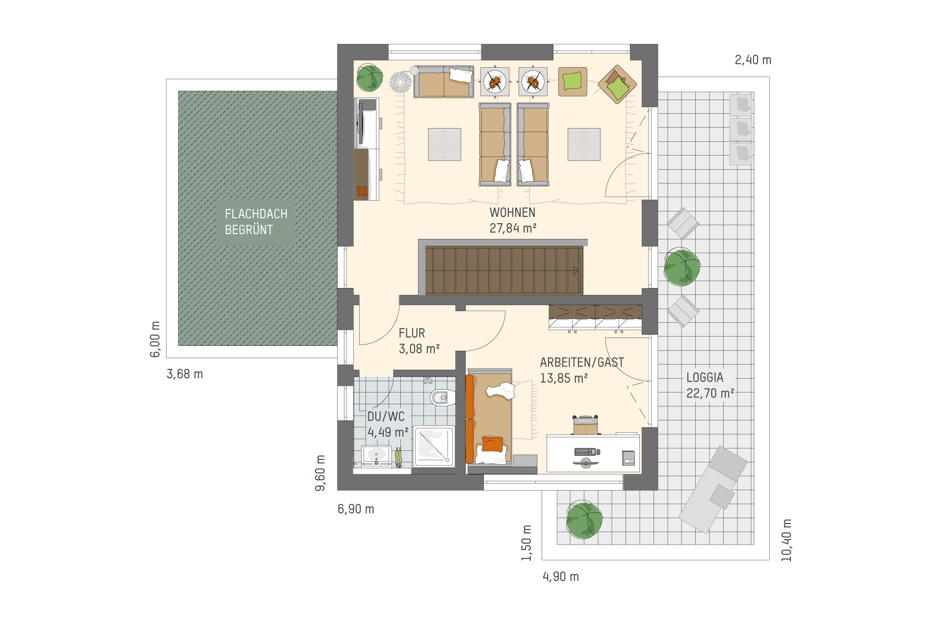 - Obergeschoss: Lichtdurchflutetes Wohnzimmer mit direktem Zugang zur Loggia – perfekt zum Entspannen.