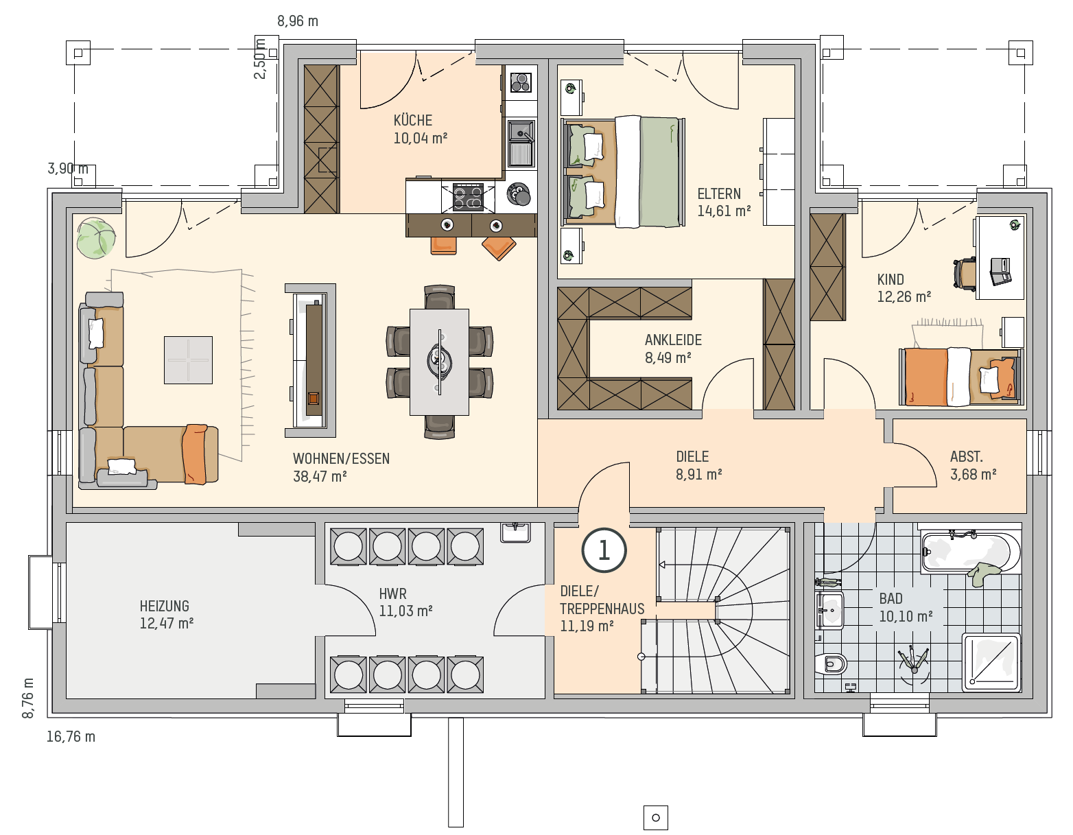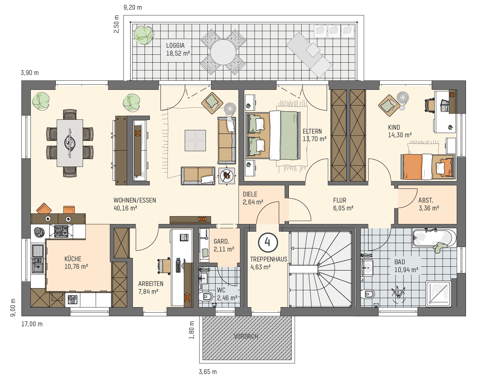 - offener Wohn-/Essbereich getrennt von privaten Rückzugsräumen